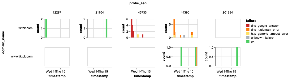 The following chart shares OONI data on the testing of www.tiktok.com and tiktok.com from 5 networks in Armenia between 13th-15th September 2022.