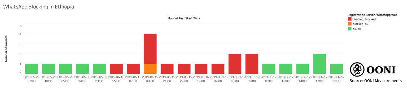 An analysis of OONI WhatsApp measurements collected over the last month reveals that WhatsApp’s registration service and web version (web.whatsapp.com) were blocked in Ethiopia between 12th to 17th June 2019, but WhatsApp’s mobile app was not blocked.